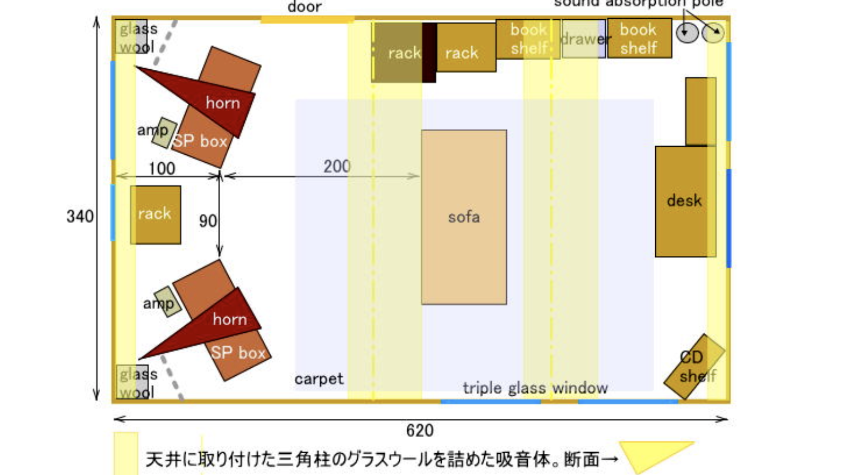 - フラッターエコーと定在波の影響を軽減するために、天井の音圧のピークとなる部分に、ベニヤ板で三角形の吸音板を取り付け、内部にグラスウールを詰める。(右上の写真)
