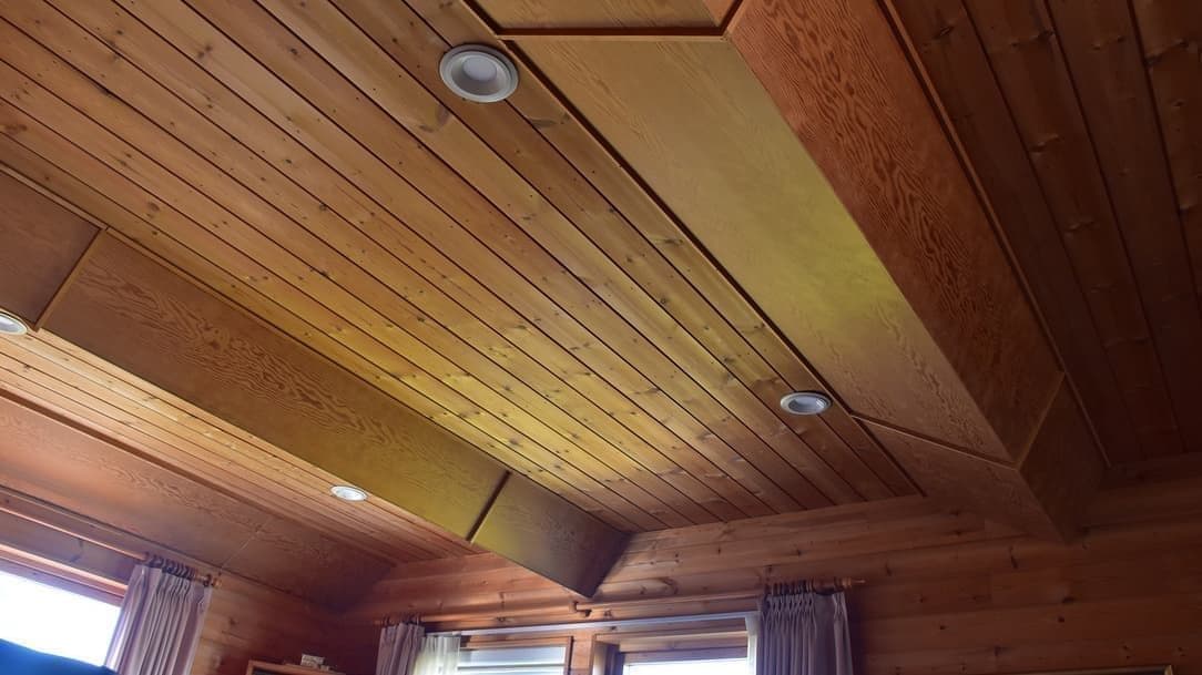 我が家は海抜約1000mの高原地帯にあり、夏は冷涼であるが 冬は−10℃以下にもなる。冬を快適に過ごすために、今は標準的になっている高気密断熱構造にした。壁は外から、サイディング、防湿シート、断熱材、石膏ボードまたはコンバネ、部屋の内装はパイン材の板張りである。天井もパイン材の板張りで、その上に断熱材が乗っている。床はフローリングで、その下には断熱材が敷いてある。天井高さは2.7m、部屋の広さはおよそ18畳である。