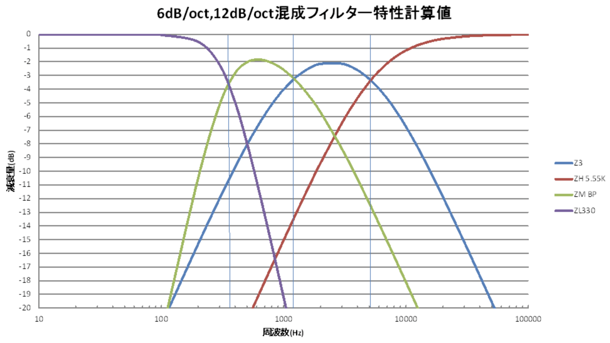低音域と中音域は12dB/oct、それ以外は6dB/oct