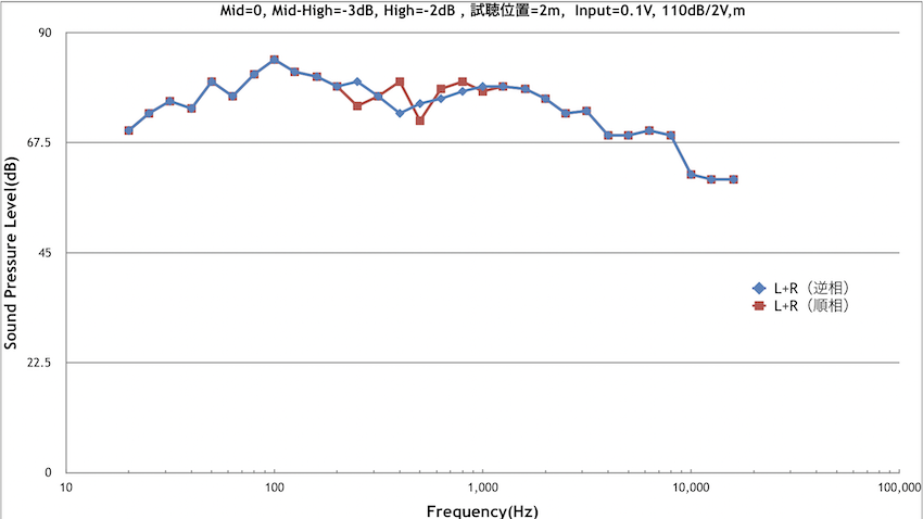 低音の100Hzを中心とするピークは、部屋の共鳴によるものと思われる。中音と中高音のクロスオーバ付近にディップが見られる。ウーファとスコッカーの極性を正相にしても逆相にしても現れる。それ以外は、ほぼ平坦な特性をしており、素直な特性だと言える。