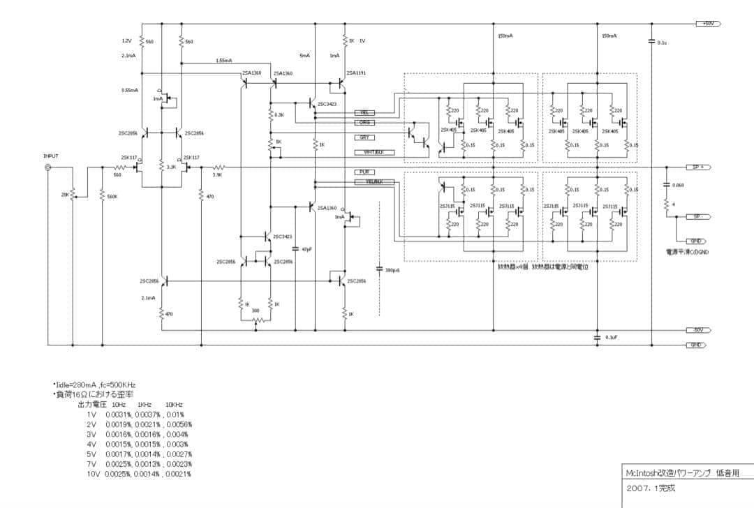 その内、ノイズが出るようになったので、思い切って分解することにした。完璧な回路図が添付されていたので、改造は比較的容易であった。出力トランスを外し、ゴトーユニット用第一作目のパワーアンプで使っていたパワーMOSがあったので、これを再利用して6パラにし、アンプも1段アンプのfolded cascade型にして、すっかり改造してしまった。